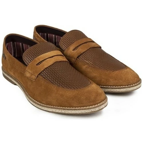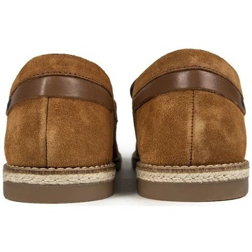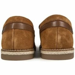 Mocassins Slip-on Base London Combie pour homme, de couleur marron, avec dessus en daim souple, dĂ©tail selle, empeigne tissĂ©e marron foncĂ© et talon assorti. Ces chaussures dĂ©contractĂ©es Ă profil bas sont dotĂ©es d’une doublure en textile rayĂ©e, d’une semelle intĂ©rieure marquĂ©e, d’une semelle intermĂ©diaire Ă effet de corde et d’une semelle en caoutchouc marquĂ©e.