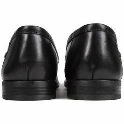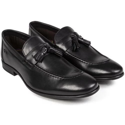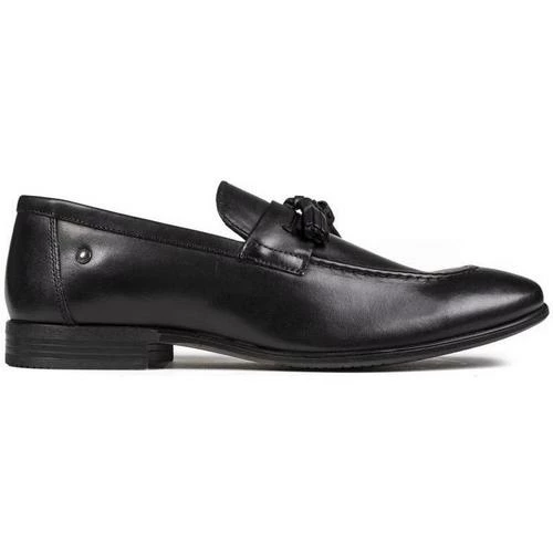 Mocassins en cuir noir Base London Ritz pour homme, avec glands sur la selle et surpiqûres ton sur ton sur le bout. Ces chaussures formelles à profil bas sont dotées d’une doublure rayée, d’une semelle en mousse matelassée et d’une semelle en synthétique.