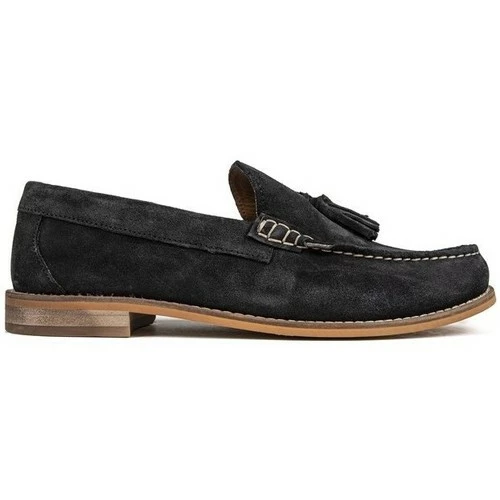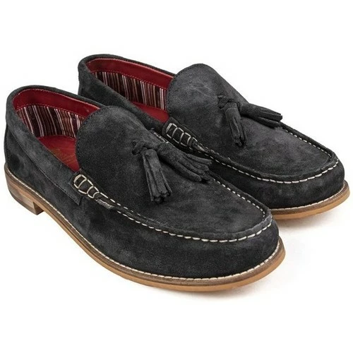 Mocassins en daim Base London Tempus pour homme, de couleur marine, avec glands sur l’empeigne et coutures contrastĂ©es sur le bout. Ces chaussures formelles Ă profil bas ont une doublure rayĂ©e et une semelle en caoutchouc marron.